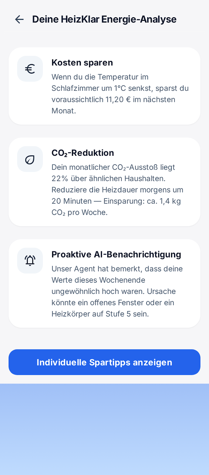 KI-Agent analysiert deinen Verbrauch und gibt konkrete Empfehlungen. Vergleiche dich mit ähnlichen Wohnungen. Durchschnittliche Ersparnis: €320/Jahr.